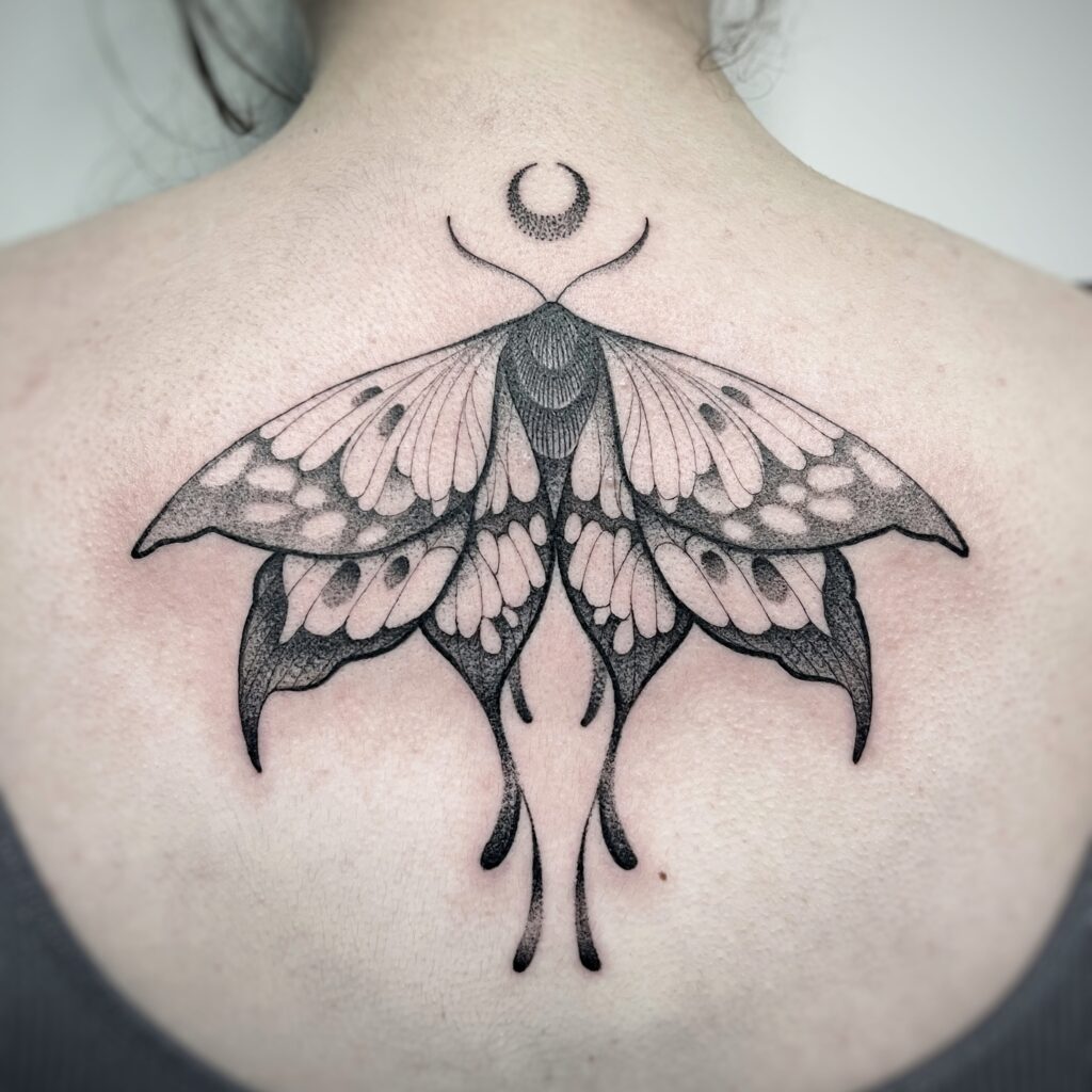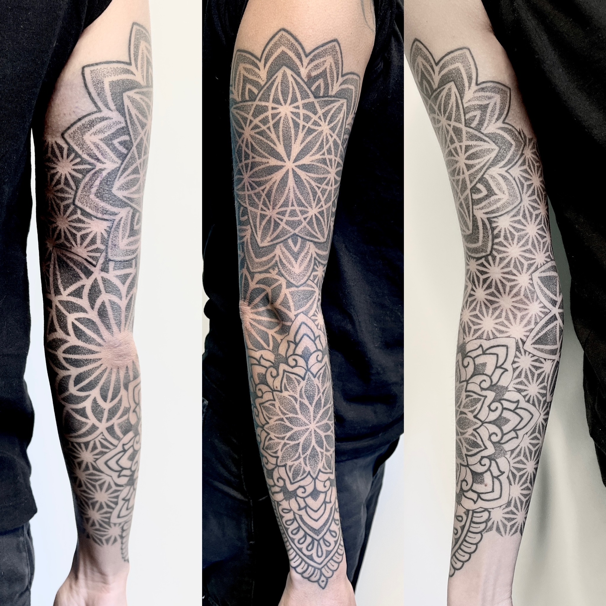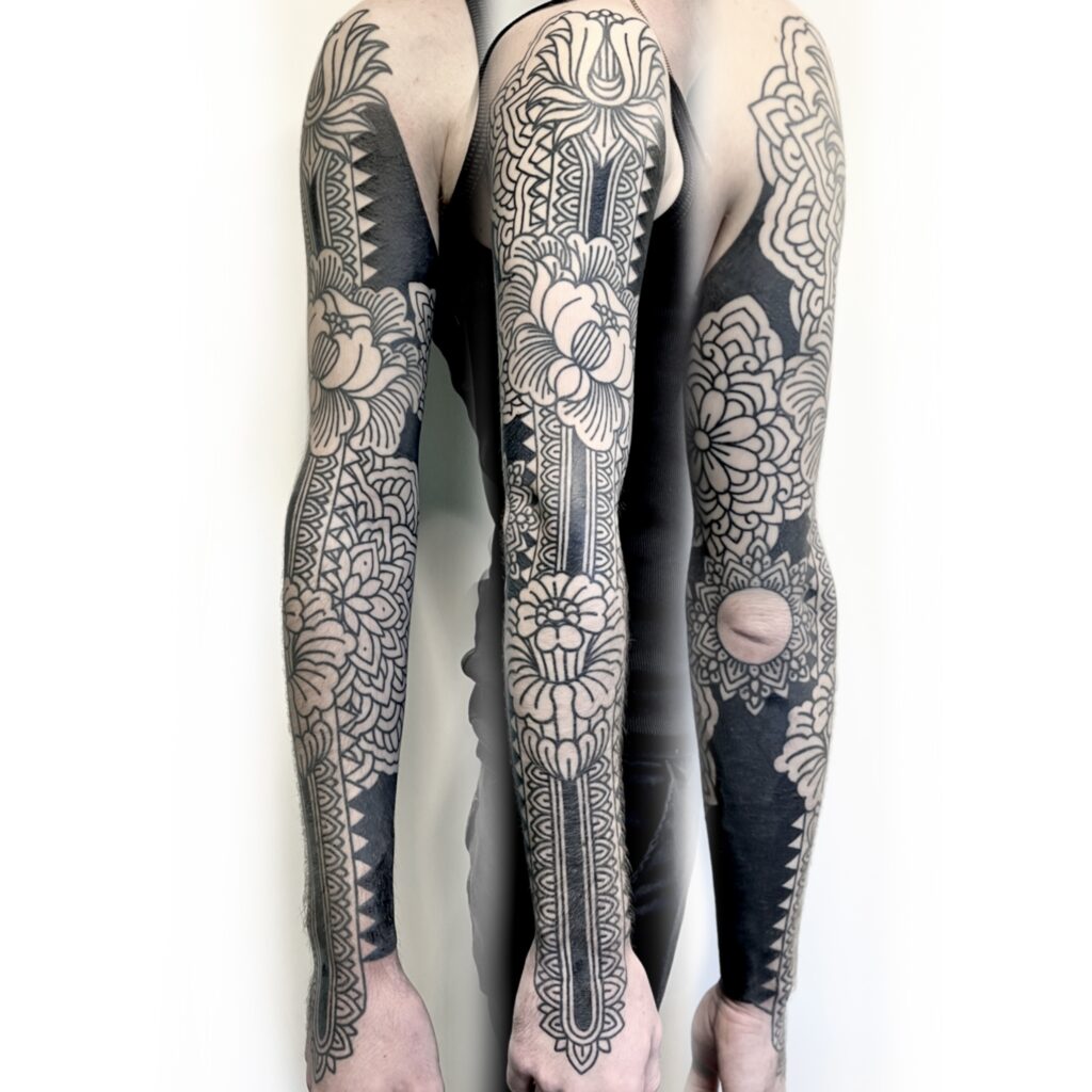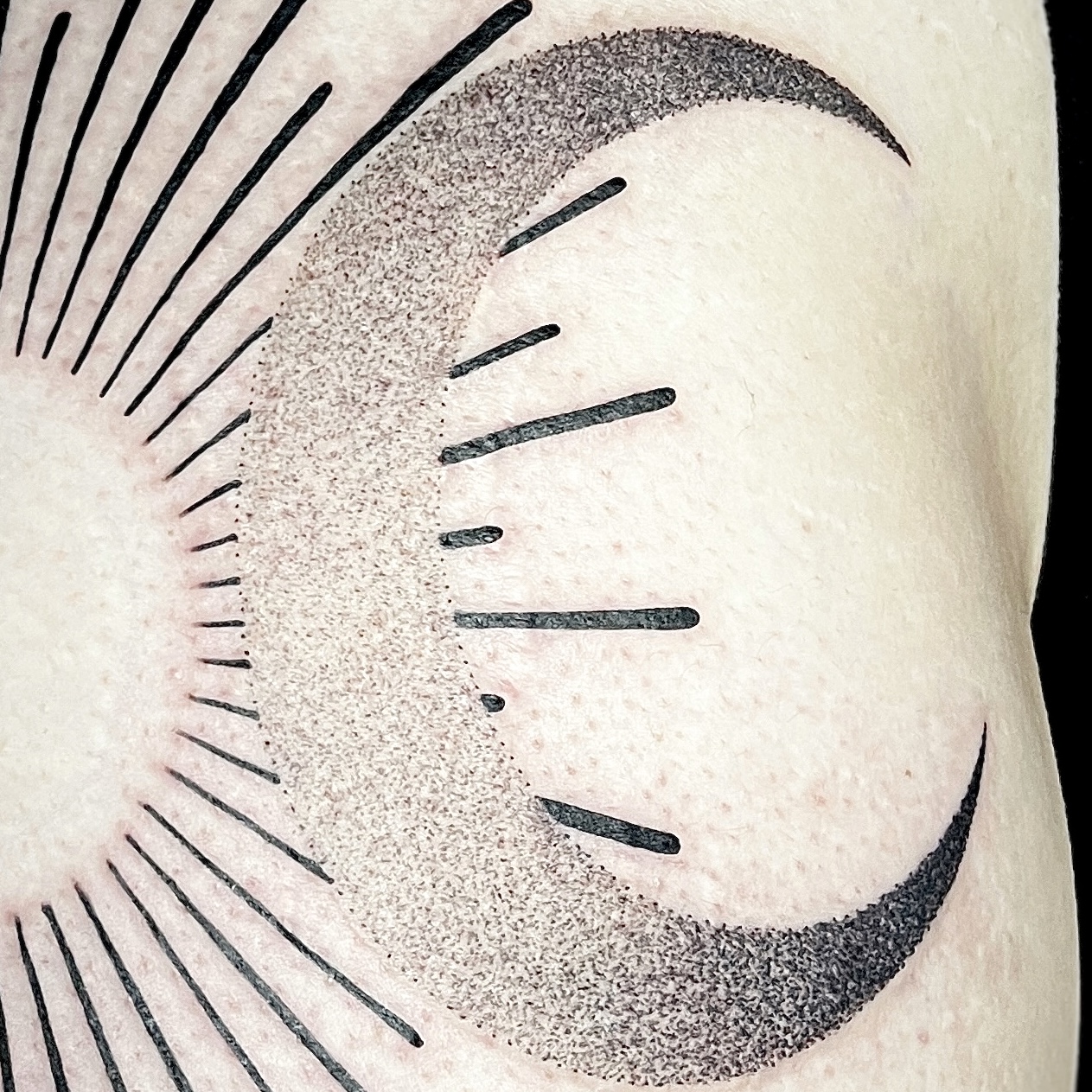 Mon univers : le noir & gris, le dotwork et les lignes, travaillés avec précision et respect.